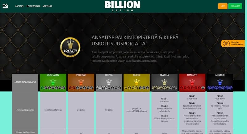 Aspire Globalin suurperheeseen kuuluva Billion Casino on kaikin puolin otollinen paikka peleistä nauttimiseen. Tutulla alustalla toimiva pelikohde on hionut ulkoasunsa sisaruksiaan näyttävämmäksi ja ainakin pientä erottumista massasta voidaan havaita. Suuria muutoksia ei kuitenkaan ole tehty, joten asiointi onnistuu tutulla tavalla helposti ja nopeasti.