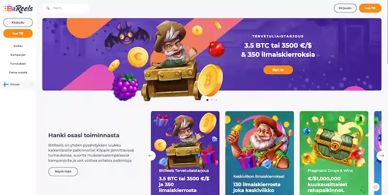 Aulassa huomion varastaa puolet ruudusta valtaava banneri, jossa pyörii mainintoja niin eduista kuin turnauksista. Kun katseen antaa valua hieman alemmas etusivulla, niin vastaan tulee niin tarkempia tietoja BitReelsistä kuin pelivalikoiman kirkkaimmat tähdet. Tämä kyseinen pohjapiirros on todella tuttu monista vastaavista palveluista, mutta miksi lähteä luomaan jotain täysin ennennäkemätöntä kun nykyinen toimii junan vessan tavoin.