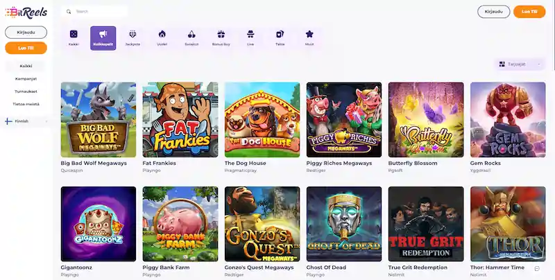 Itse pelit on jaettu useisiin kategorioihin ja niitä on varsin kätevä selata juuri tästä syystä. Nämä luokat löytyvät pelisivun yläreunasta, jossa sijaitsee myös BitReelsin haku, joka avustaa etsintätyössä jos luokittelusta ei juuri oikeaa ryhmää meinaa löytyä. Jaottelua voi kuitenkin tehdä muun muassa kolikkopelien, jättipottien, viimeisimpien julkaisujen mukaan, joten hakukenttään ei juuri tarvitse kajota.