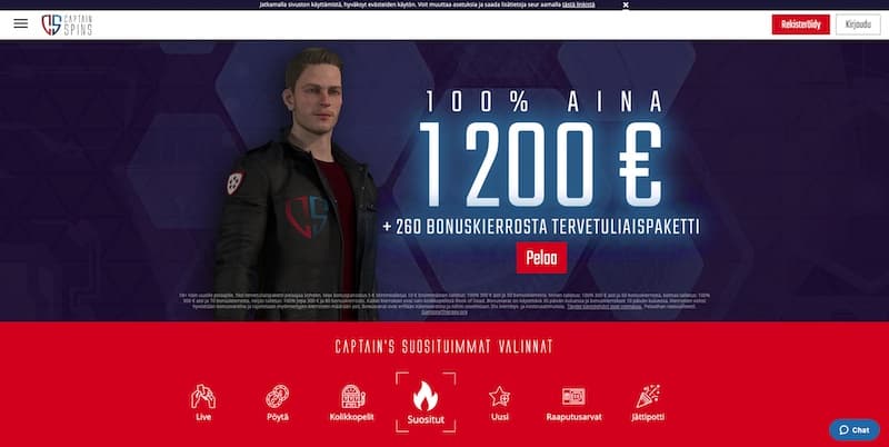 Ennen sivustolle saapumista mielessä pyörivät varmasti jo kaikenlaiset mielikuvat, joita casino-operaattorin nimi herättää. Monille saattaa tulla mieleen esimerkiksi ikoninen Marvel sankari, Captain America, joka muistuttaa hyvin paljon supersankareita ainakin vaatetukseltaan. Captain Spins on kuitenkin täysin eri maata, sillä etusivulla vastaan tulee maanläheinen ja arkiseen asuun pukeutunut nuori herrasmies.