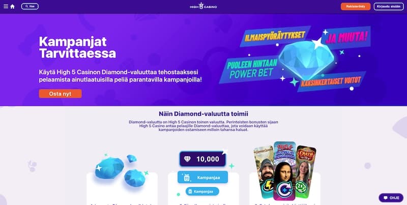 Hyvän kampanja kattauksen vuoksi High 5 Casino toimii hyvin myös eduista nauttiville pelaajille. Käytössä oleva timantti valuuttaa antaa pelaajille mahdollisuuden valita itse kampanjansa, joten enää ei tarvitse mennä pelkästään kasinosivuston tarjonnan mukaan, vaan myös omilla valinnoilla on merkitystä.