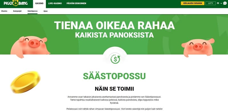 PiggyBang esittelee käyttäjilleen Säästöpossu -ohjelman, joka rakentaa ikään kuin oman peliseikkailunsa, jonka kautta eri peleistä voi kerätä säästöjä omaan lippaaseensa. Säästöpossu ohjelma on käytännössä käteispalautusohjelma, jonka kautta operaattori antaa pelaajille takaisin jokaisesta casino-sivulla asetetusta palautuksesta.