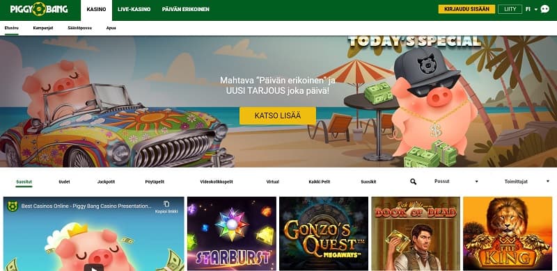 “Kierrätysvapaat kierrokset tervetuliaistarjouksena kannattaa ainakin lunastaa ja itse käyn yleensä katsomassa myös päivän erikoinen -kampanjat. Piggy Bang Casino kannattaa testata muutenkin sen ison pelikirjaston ja sivuston hauskan teeman takia.”