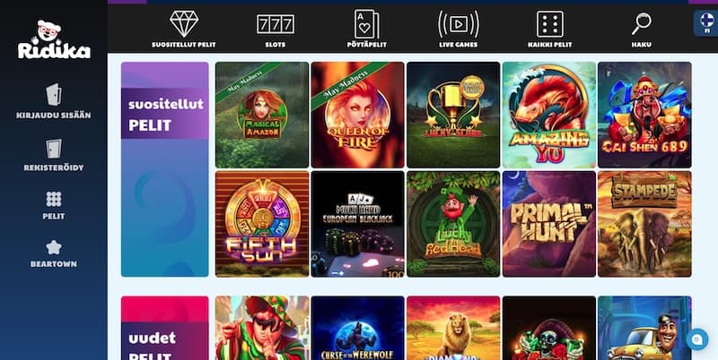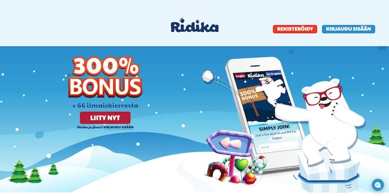 Käyttöliittymä itsessään toimii tasaisen varmasti niin tietokoneella kuin puhelimellakin. Sen erikoisuutena on kuitenkin näyttävä julkisivu, jossa pääsee gamification-tyylittelyllä varustettuun casino-tunnelmaan Ridika-karhun saattelemana. Menoa ja melskettä on siis luvassa, vaikka pelikirjasto itsessään ei ole ihan parhaasta päästä.