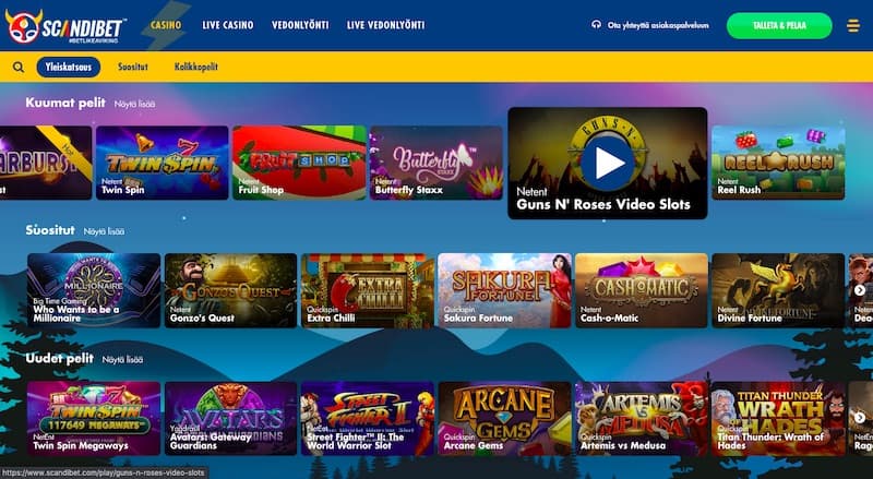Kyseessä on laadukas ja monipuolinen pelipaikka, joka tarjoaa asiakkailleen tilivapaata pelaamista. Scandibetin tarjontaan kuuluu casino-pelien ja live-viihteen lisäksi myös vedonlyönti ja live-vedonlyönti. Tämä tarkoittaa sitä, että kattavasta valikoimasta pääsevät nauttimaan jyrien lisäksi myös kaiken karvaiset vedonlyöjät.