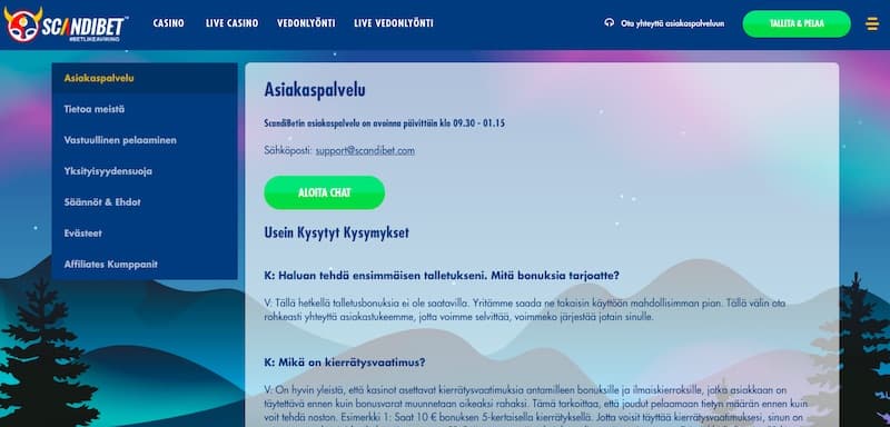 Kohtasitko casino-sivustolla pelatessasi ongelman, joka ei tunnu ratkeavan omin avuin? Ei hätää, sillä asiakaspalvelu on olemassa juuri tätä varten. Avaa asiakaspalvelu-näkymä sivuston sivupalkista, niin pääset selvittämään ongelmaa tarkemmin. Scandibet Casino onkin luonut yli 20 kysymystä ja vastausta sisältävän osion, johon kannattaa tutustua kaikissa mahdollisissa ongelmatilanteissa.