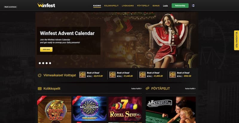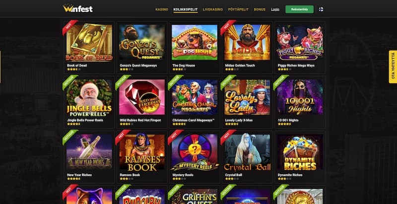 Kyseinen operaattori vastaanottaa sivustonsa vierailijat isolla bannerilla, joka tunnetusti mainostaa tarjolla olevia tarjouksia ja muita kampanjoita. Mainosbannerin alta löytyy perinteisellä viihdeluolan suunnittelulla aina pelivalikoima ja näin on homma toteutettu myös Winfestin tapauksessa. Suurempia, turhia yllätyksiä ei tule vastaan ainakaan ensimmäisellä vierailulla