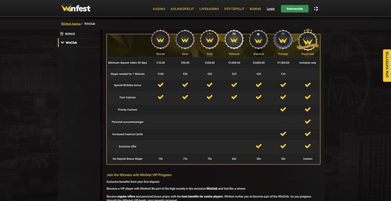 Kaiken kaikkiaan tämä piirun verran tuntemattomampi casino-luola tarjoaa käyttäjilleen mukavan pelielämyksen laadukkaasti rakennetusta verkkosivustosta lähtien aina mukavaan valikoimaan erilaisia pelejä, joiden parissa voi helposti viihtyä päivästä toiseen. Winfest tarjoaa käyttäjilleen mukavan pelivalikoiman lisäksi myös mukavia tarjouksia sekä muita etuja, jotka vaihtuvat jopa kuukausittain.